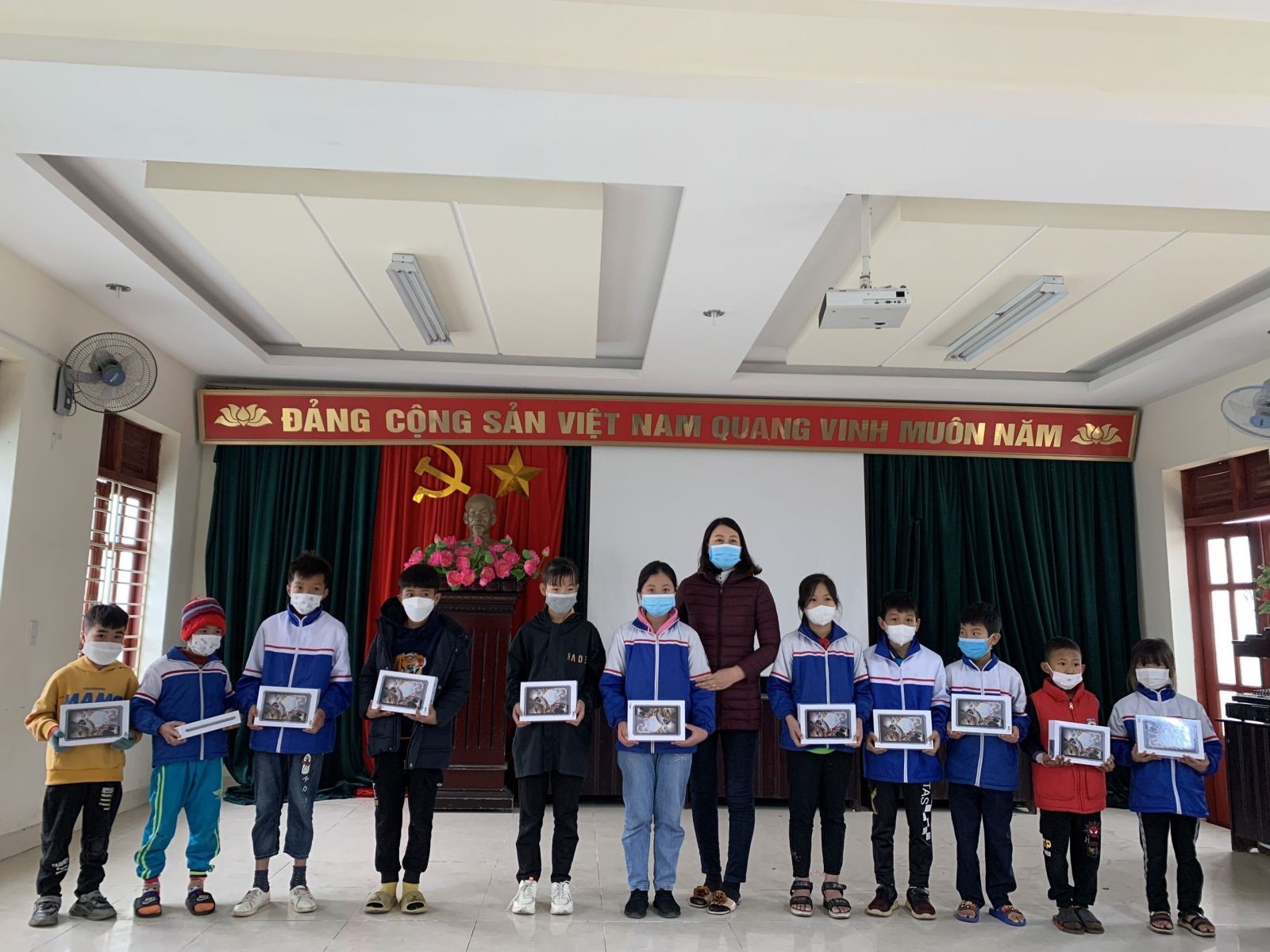 Cô Đặng Thị Liên-Bí thư chi bộ, hiệu trường trao máy tính cho 11 học sinh